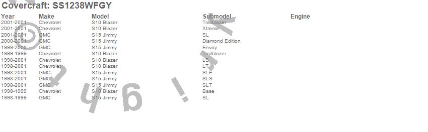 Below is an abbreviated list of applications for the SeatSaver Custom Seat Cover.S10 Blazer, S15 Jimmy, Chevrolet, GMC, 2001, 2000, 1999, 1998