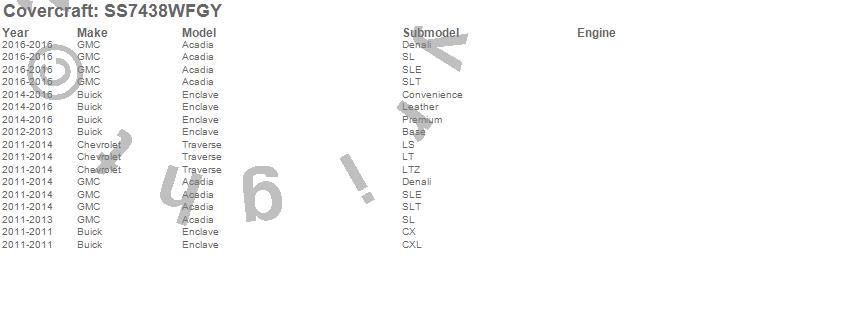 Below is an abbreviated list of applications for the SeatSaver Custom Seat Cover.Acadia, Enclave, Traverse, Buick, Chevrolet, GMC, 2016, 2015, 2014, 2013, 2012, 2011