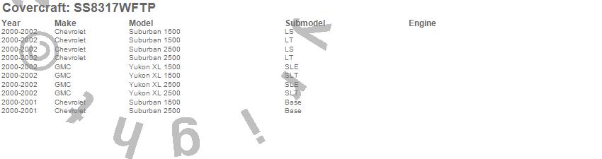 Below is an abbreviated list of applications for the SeatSaver Custom Seat Cover.Suburban 1500, Suburban 2500, Yukon XL 1500, Yukon XL 2500, Chevrolet, GMC, 2002, 2001, 2000