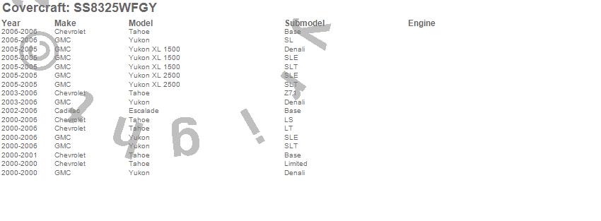 Below is an abbreviated list of applications for the SeatSaver Custom Seat Cover.Escalade, Tahoe, Yukon, Yukon XL 1500, Yukon XL 2500, Cadillac, Chevrolet, GMC, 2006, 2005, 2004, 2003, 2002, 2001, 2000