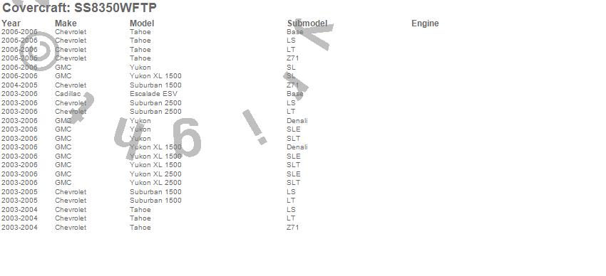 Below is an abbreviated list of applications for the SeatSaver Custom Seat Cover.Escalade ESV, Suburban 1500, Suburban 2500, Tahoe, Yukon, Yukon XL 1500, Yukon XL 2500, Cadillac, Chevrolet, GMC, 2006, 2005, 2004, 2003