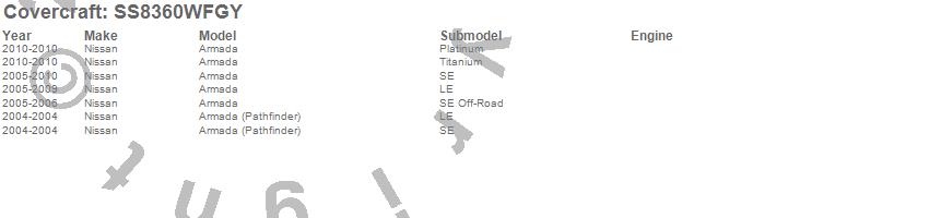 Below is an abbreviated list of applications for the SeatSaver Custom Seat Cover.Armada, Armada (Pathfinder), Nissan, 2010, 2009, 2008, 2007, 2006, 2005, 2004