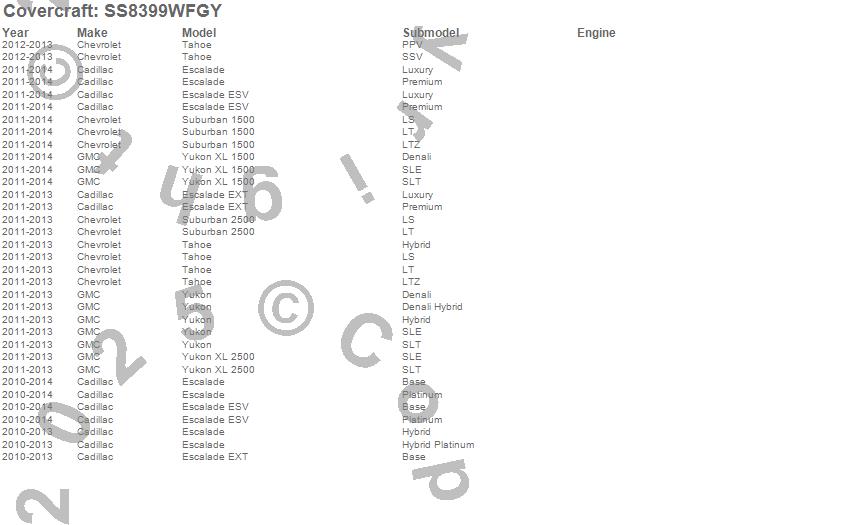 Below is an abbreviated list of applications for the SeatSaver Custom Seat Cover.Escalade, Escalade ESV, Escalade EXT, Suburban 1500, Suburban 2500, Tahoe, Yukon, Yukon XL 1500, Yukon XL 2500, Cadillac, Chevrolet, GMC, 2014, 2013, 2012, 2011, 2010