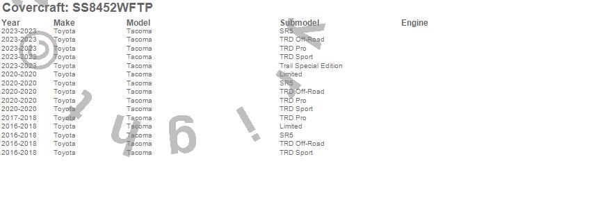Below is an abbreviated list of applications for the SeatSaver Custom Seat Cover.Tacoma, Toyota, 2023, 2020, 2018, 2017, 2016