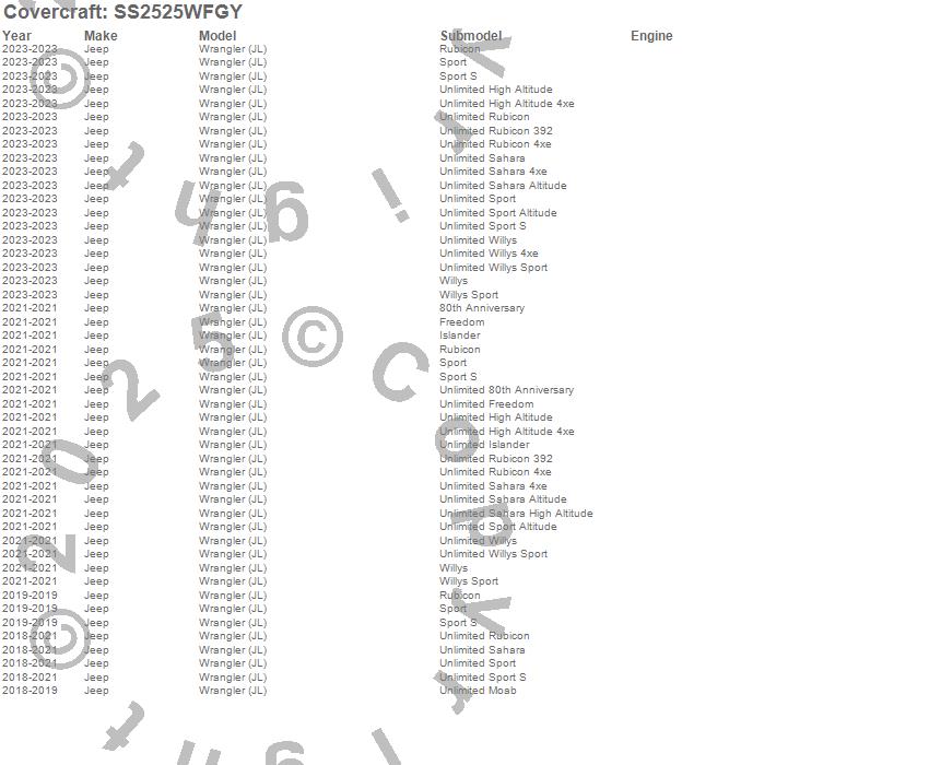 Below is an abbreviated list of applications for the SeatSaver Custom Seat Cover.Gladiator, Pickup Gladiator, Wrangler, Wrangler (JL), Jeep, 2025, 2024, 2023, 2021, 2020, 2019, 2018