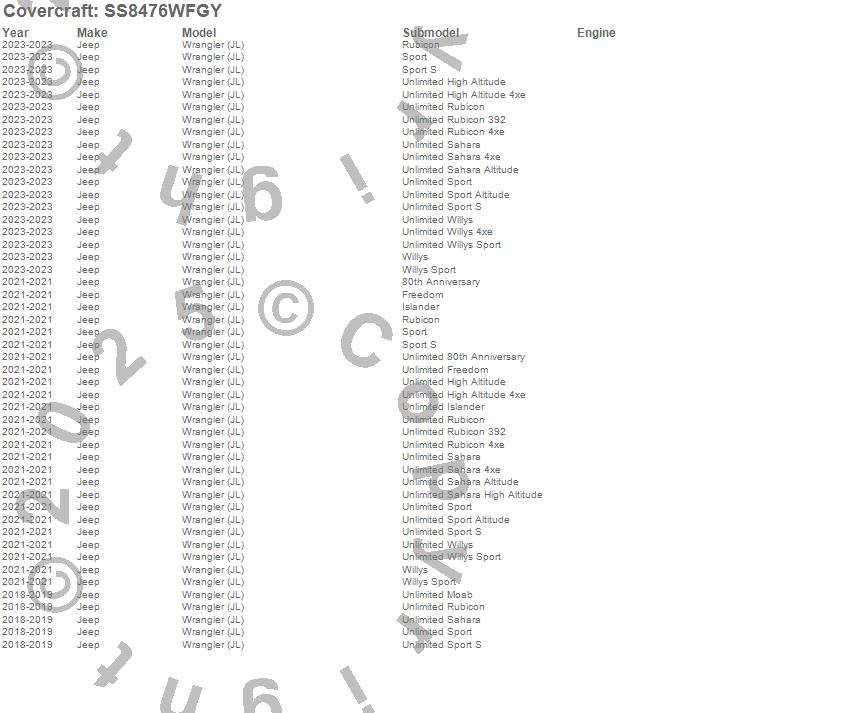 Below is an abbreviated list of applications for the SeatSaver Custom Seat Cover.Wrangler, Wrangler (JL), Jeep, 2025, 2024, 2023, 2022, 2021, 2019, 2018