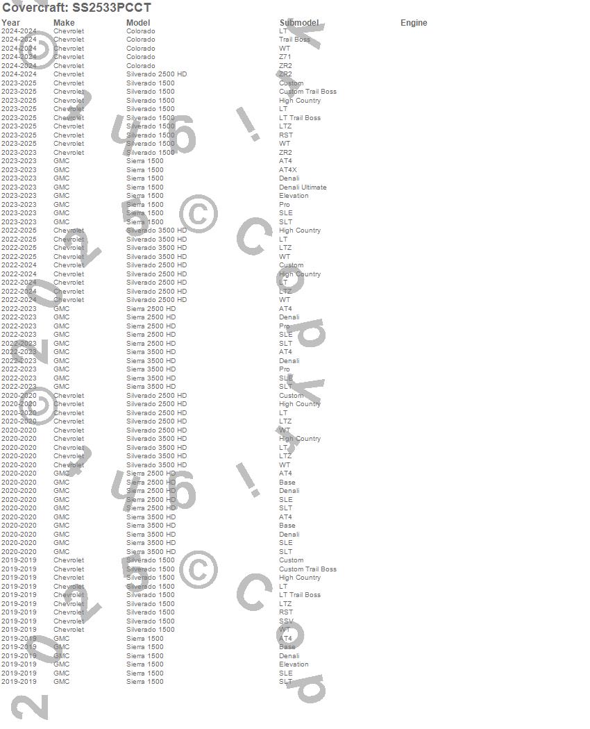 Below is an abbreviated list of applications for the SeatSaver Custom Seat Cover.Canyon, Colorado, Sierra 1500, Sierra 2500 HD, Sierra 3500 HD, Silverado 1500, Silverado 2500 HD, Silverado 3500 HD, Chevrolet, GMC, 2026, 2025, 2024, 2023, 2022, 2020, 2019