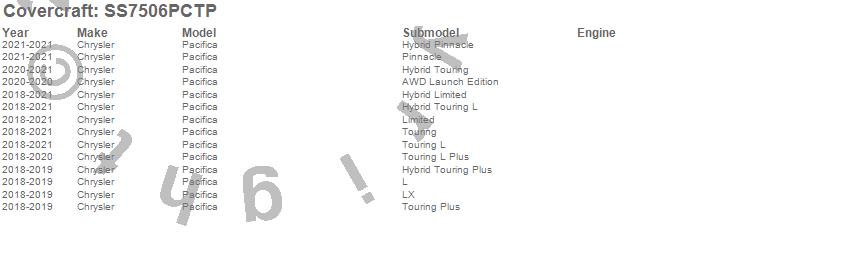 Below is an abbreviated list of applications for the SeatSaver Custom Seat Cover.Pacifica, Chrysler, 2021, 2020, 2019, 2018