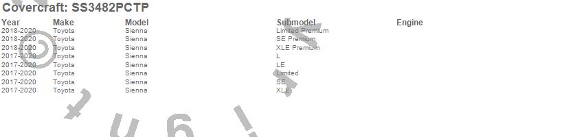 Below is an abbreviated list of applications for the SeatSaver Custom Seat Cover.Sienna, Toyota, 2020, 2019, 2018, 2017