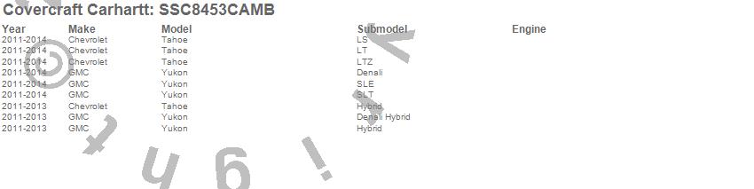 Below is an abbreviated list of applications for the Covercraft Carhartt SeatSaver.Tahoe, Yukon, Chevrolet, GMC, 2014, 2013, 2012, 2011