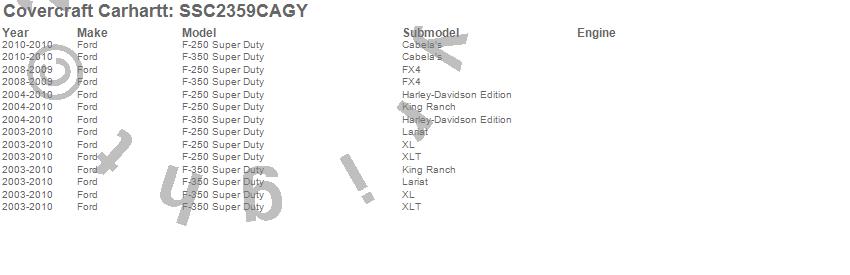 Below is an abbreviated list of applications for the Covercraft Carhartt SeatSaver.F-250 Super Duty, F-350 Super Duty, Ford, 2010, 2009, 2008, 2007, 2006, 2005, 2004, 2003
