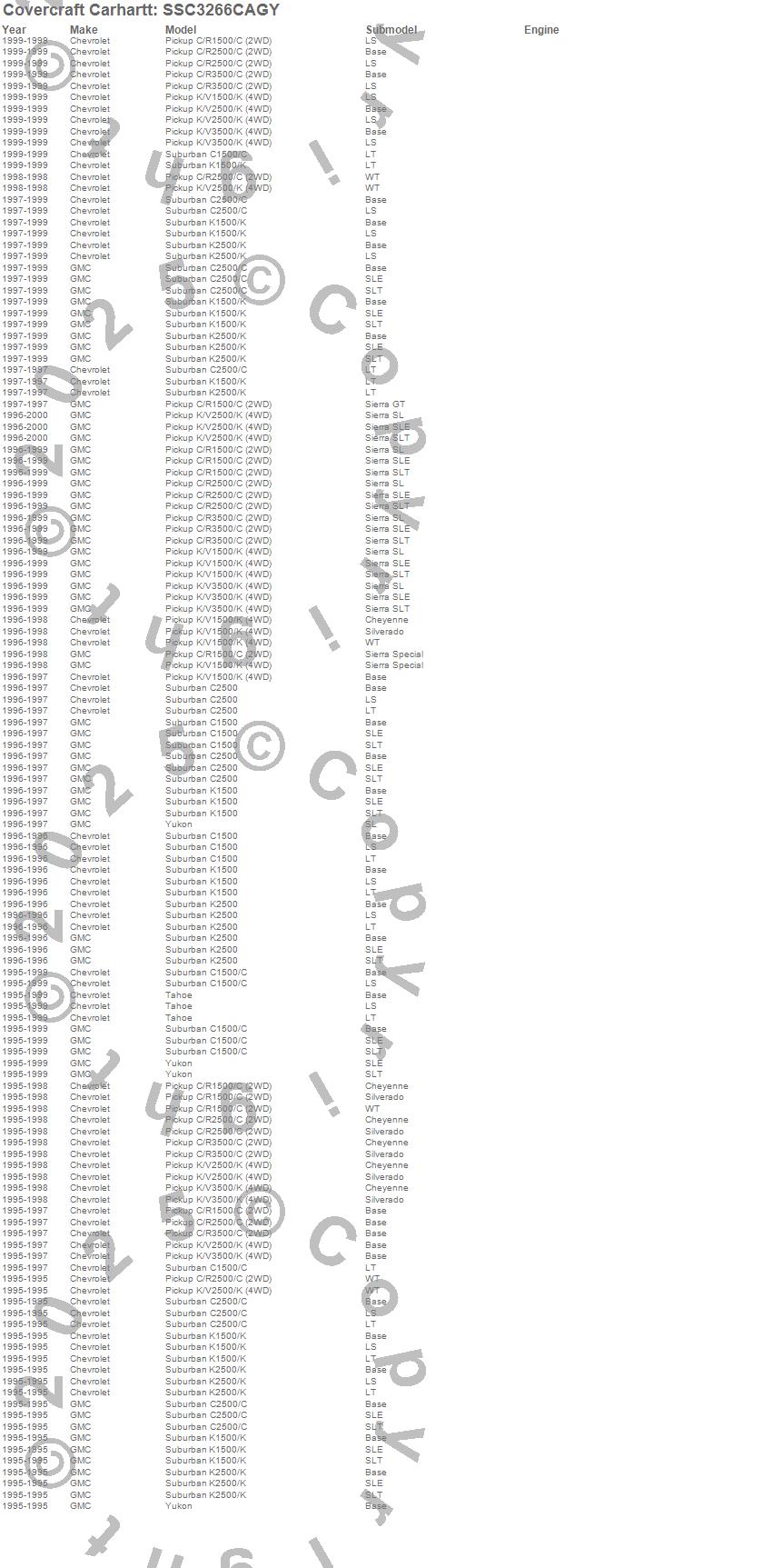 Below is an abbreviated list of applications for the Covercraft Carhartt SeatSaver.C1500 Pickup, C1500 Suburban, C2500 Pickup, C2500 Suburban, C3500 Pickup, K1500 Pickup, K1500 Suburban, K2500 Pickup, K2500 Suburban, K3500 Pickup, Tahoe, Yukon, Chevrolet, GMC, 2000, 1999, 1998, 1997, 1996, 1995