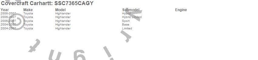 Below is an abbreviated list of applications for the Covercraft Carhartt SeatSaver.Highlander, Toyota, 2007, 2006, 2005, 2004