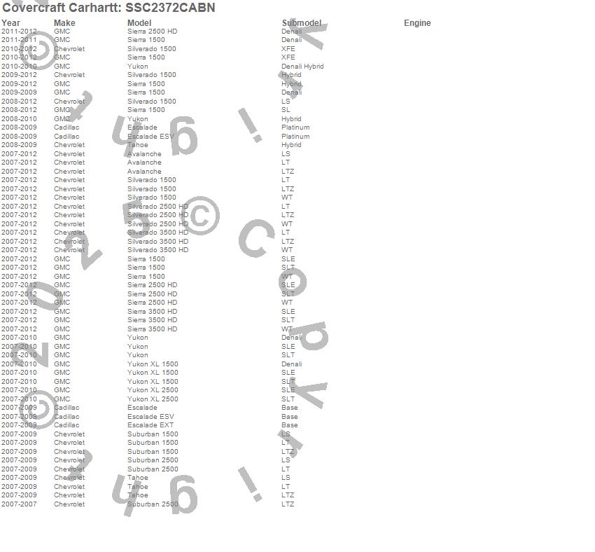 Below is an abbreviated list of applications for the Covercraft Carhartt SeatSaver.Avalanche, Escalade, Escalade ESV, Escalade EXT, Sierra 1500, Sierra 2500 HD, Sierra 3500 HD, Silverado 1500, Silverado 2500 HD, Silverado 3500 HD, Suburban 1500, Suburban 2500, Tahoe, Yukon, Yukon XL 1500, Yukon XL 2500, Cadillac, Chevrolet, GMC, 2012