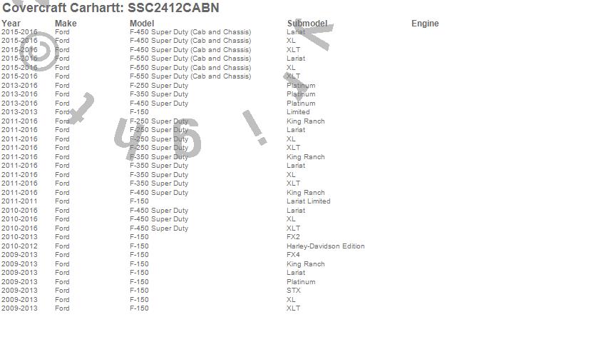 Below is an abbreviated list of applications for the Covercraft Carhartt SeatSaver.F-150, F-250 Super Duty, F-350 Super Duty, F-450 Super Duty, F-550 Super Duty, Ford, 2016, 2015, 2014, 2013, 2012, 2011, 2010, 2009