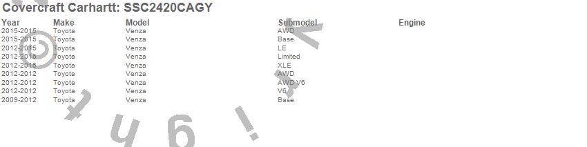 Below is an abbreviated list of applications for the Covercraft Carhartt SeatSaver.Venza, Toyota, 2015, 2014, 2013, 2012, 2011, 2010, 2009