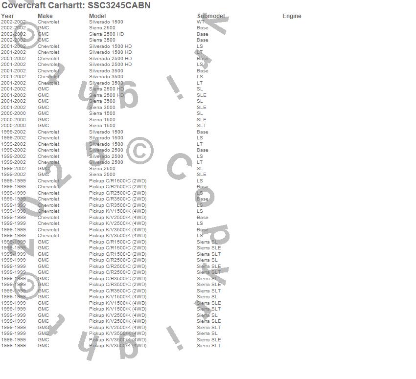 Below is an abbreviated list of applications for the Covercraft Carhartt SeatSaver.C1500 Pickup, C2500 Pickup, C3500 Pickup, K1500 Pickup, K2500 Pickup, K3500 Pickup, Sierra 1500, Sierra 2500, Sierra 2500 HD, Sierra 3500, Silverado 1500, Silverado 1500 HD, Silverado 2500, Silverado 2500 HD, Silverado 3500, Chevrolet, GMC, 2002, 2001, 2000
