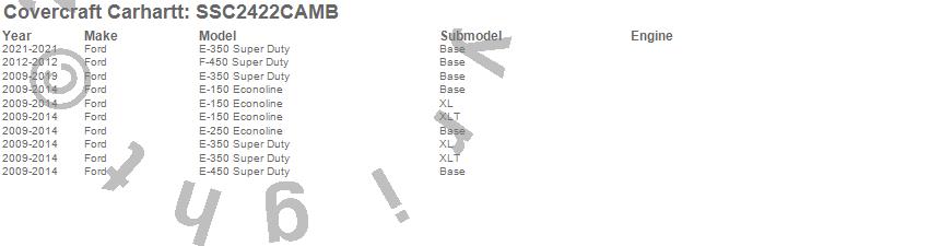 Below is an abbreviated list of applications for the Covercraft Carhartt SeatSaver.E-150 Econoline, E-250 Econoline, E-350 Super Duty, E-450 Super Duty, F-450 Super Duty, Ford, 2025, 2024, 2023, 2022, 2021, 2019, 2018, 2017, 2016, 2015, 2014, 2013, 2012, 2011