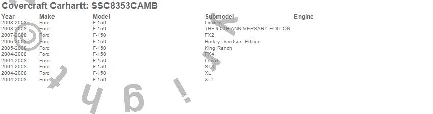 Below is an abbreviated list of applications for the Covercraft Carhartt SeatSaver.F-150, Ford, 2008, 2007, 2006, 2005, 2004