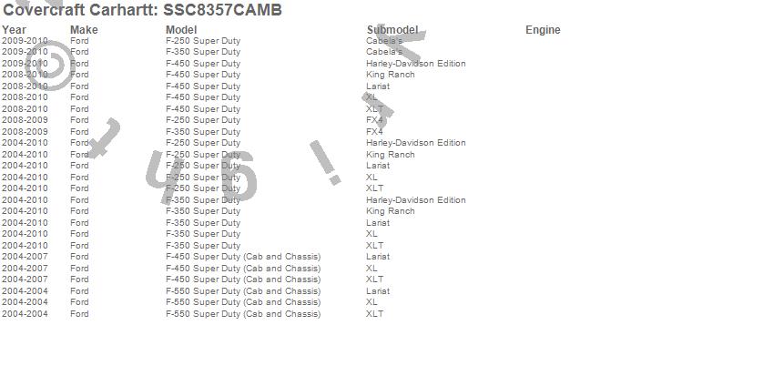Below is an abbreviated list of applications for the Covercraft Carhartt SeatSaver.F-250 Super Duty, F-350 Super Duty, F-450 Super Duty, F-550 Super Duty, Ford, 2010, 2009, 2008, 2007, 2006, 2005, 2004