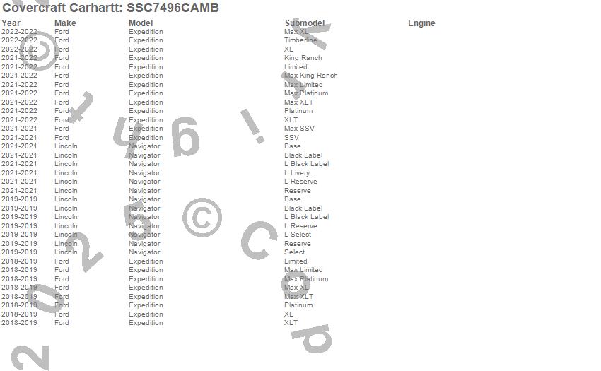 Below is an abbreviated list of applications for the Covercraft Carhartt SeatSaver.Expedition, Navigator, Ford, Lincoln, 2025, 2024, 2022, 2021, 2020, 2019, 2018