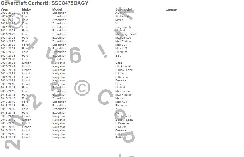 Below is an abbreviated list of applications for the Covercraft Carhartt SeatSaver.Expedition, Navigator, Ford, Lincoln, 2025, 2024, 2023, 2022, 2021, 2020, 2019, 2018
