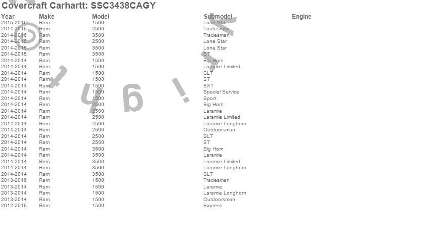 Below is an abbreviated list of applications for the Covercraft Carhartt SeatSaver.1500, 2500, 3500, Ram, 2016, 2015, 2014, 2013, 2012