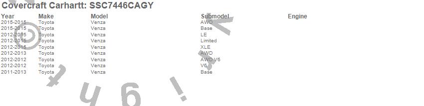 Below is an abbreviated list of applications for the Covercraft Carhartt SeatSaver.Venza, Toyota, 2015, 2014, 2013, 2012, 2011
