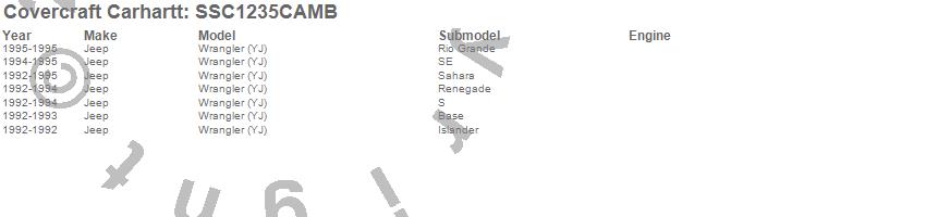 Below is an abbreviated list of applications for the Covercraft Carhartt SeatSaver.Wrangler (YJ), Jeep, 1995, 1994, 1993, 1992