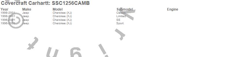 Below is an abbreviated list of applications for the Covercraft Carhartt SeatSaver.Cherokee (XJ), Jeep, 2001, 2000, 1999, 1998, 1997, 1996
