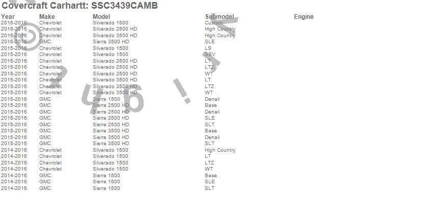 Below is an abbreviated list of applications for the Covercraft Carhartt SeatSaver.Sierra 1500, Sierra 2500 HD, Sierra 3500 HD, Silverado 1500, Silverado 2500 HD, Silverado 3500 HD, Chevrolet, GMC, 2016, 2015, 2014