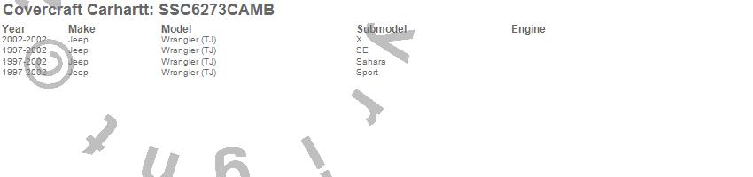 Below is an abbreviated list of applications for the Covercraft Carhartt SeatSaver.Wrangler (TJ), Jeep, 2002, 2001, 2000, 1999, 1998, 1997