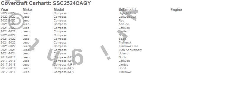 Below is an abbreviated list of applications for the Covercraft Carhartt SeatSaver.Compass, Jeep, 2023, 2022, 2021, 2018, 2017
