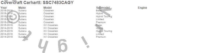 Below is an abbreviated list of applications for the Covercraft Carhartt SeatSaver.Crosstrek, XV Crosstrek, Subaru, 2016, 2015, 2014
