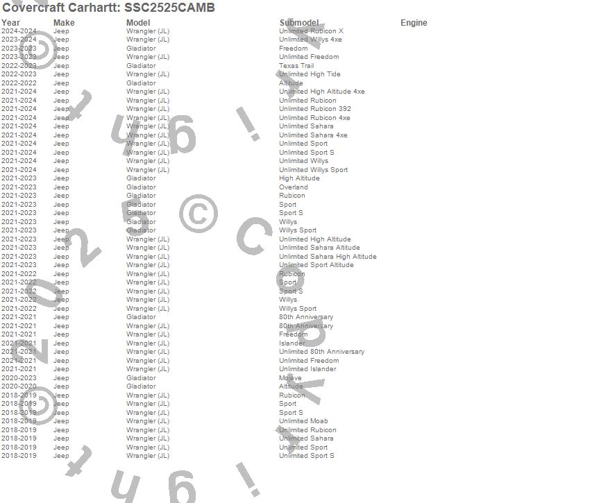 Below is an abbreviated list of applications for the Covercraft Carhartt SeatSaver.Gladiator, Pickup Gladiator, Wrangler (JL), Jeep, 2025, 2024, 2023, 2022, 2021, 2020, 2019, 2018
