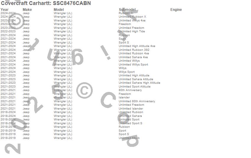 Below is an abbreviated list of applications for the Covercraft Carhartt SeatSaver.Wrangler (JL), Jeep, 2025, 2024, 2023, 2022, 2021, 2020, 2019, 2018