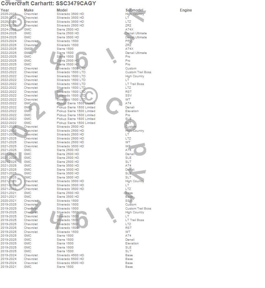 Below is an abbreviated list of applications for the Covercraft Carhartt SeatSaver.Pickup Sierra 1500 Limited, Sierra 1500, Sierra 2500 HD, Sierra 3500 HD, Silverado 1500, Silverado 1500 LTD, Silverado 2500 HD, Silverado 3500 HD, Silverado 4500 HD, Silverado 5500 HD, Silverado 6500 HD, Chevrolet, GMC, 2026, 2025, 2024, 2023, 2022, 2021, 2020