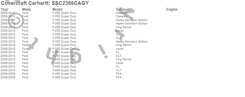Below is an abbreviated list of applications for the Covercraft Carhartt SeatSaver.F-250 Super Duty, F-350 Super Duty, F-450 Super Duty, Ford, 2010, 2009, 2008