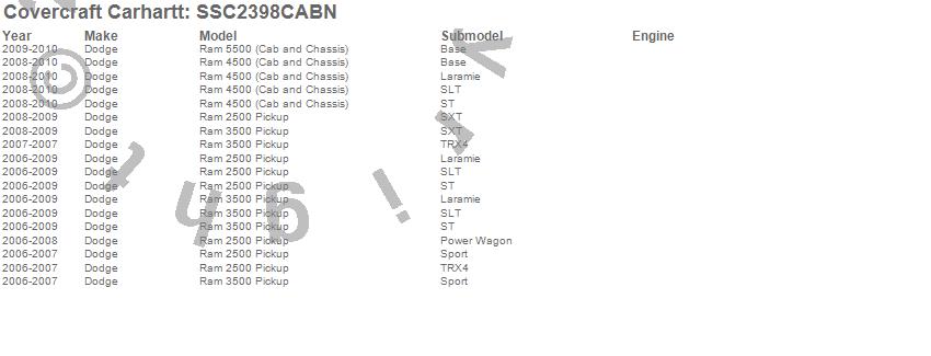 Below is an abbreviated list of applications for the Covercraft Carhartt SeatSaver.Ram 2500, Ram 3500, Ram 4500, Ram 5500, Dodge, 2010, 2009, 2008, 2007, 2006