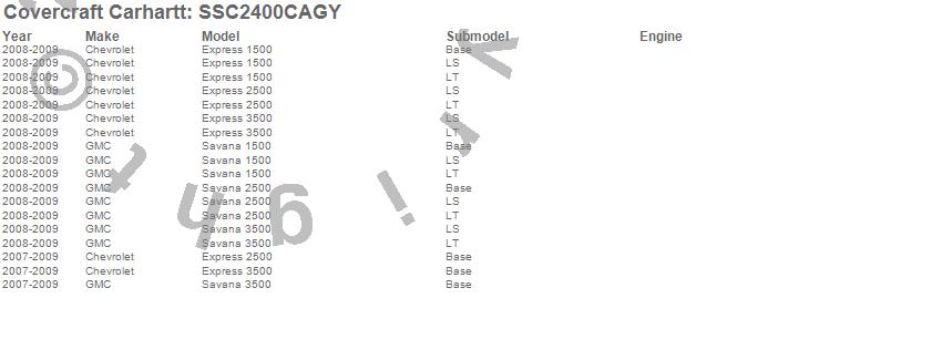 Below is an abbreviated list of applications for the Covercraft Carhartt SeatSaver.Express 1500, Express 2500, Express 3500, Savana 1500, Savana 2500, Savana 3500, Chevrolet, GMC, 2009, 2008, 2007