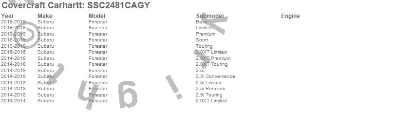 Below is an abbreviated list of applications for the Covercraft Carhartt SeatSaver.Forester, Subaru, 2019, 2018, 2017, 2016, 2015, 2014