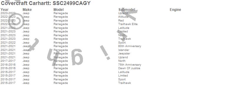 Below is an abbreviated list of applications for the Covercraft Carhartt SeatSaver.Renegade, Jeep, 2023, 2022, 2021, 2020, 2017, 2016, 2015