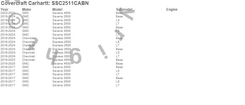 Below is an abbreviated list of applications for the Covercraft Carhartt SeatSaver.Express 2500, Express 3500, Express 4500, Savana 2500, Savana 3500, Savana 4500, Chevrolet, GMC, 2025, 2024, 2023, 2022, 2021, 2020, 2019, 2018, 2017, 2016