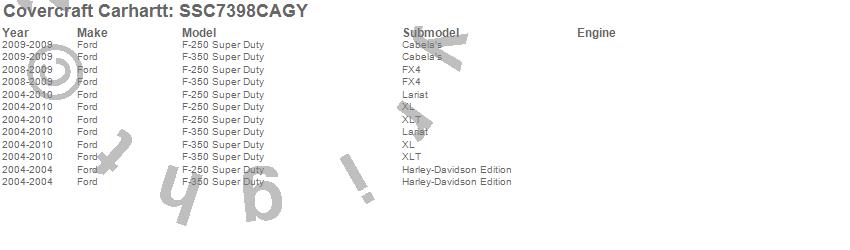 Below is an abbreviated list of applications for the Covercraft Carhartt SeatSaver.F-250 Super Duty, F-350 Super Duty, Ford, 2010, 2009, 2008, 2007, 2006, 2005, 2004