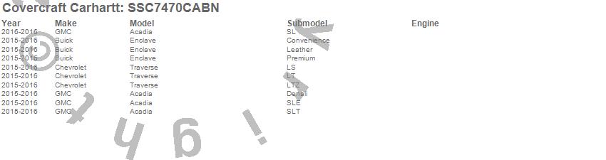 Below is an abbreviated list of applications for the Covercraft Carhartt SeatSaver.Acadia, Enclave, Traverse, Buick, Chevrolet, GMC, 2016, 2015