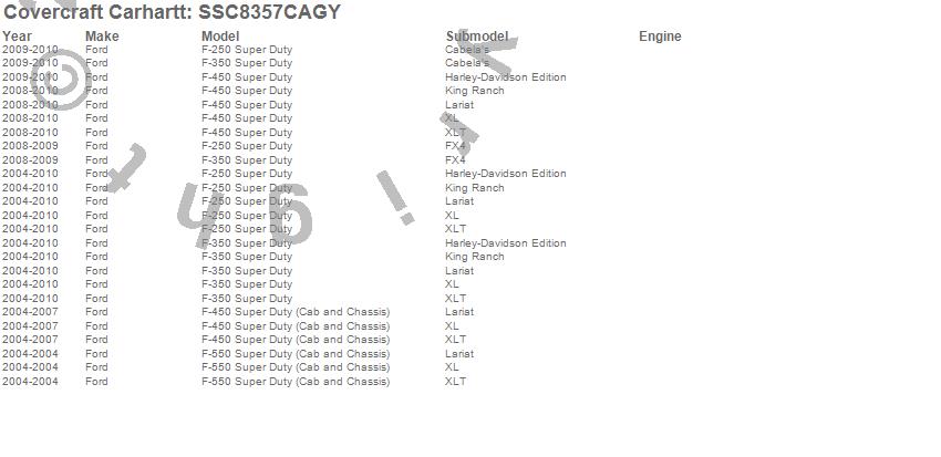 Below is an abbreviated list of applications for the Covercraft Carhartt SeatSaver.F-250 Super Duty, F-350 Super Duty, F-450 Super Duty, F-550 Super Duty, Ford, 2010, 2009, 2008, 2007, 2006, 2005, 2004