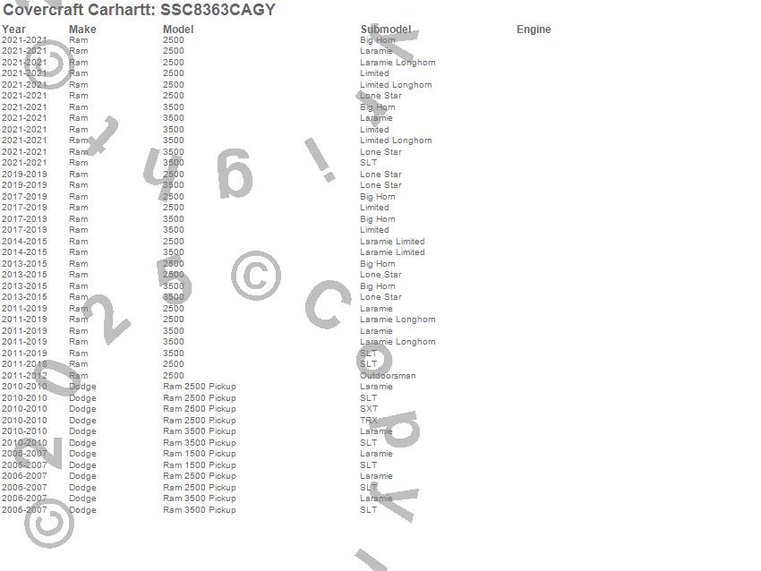 Below is an abbreviated list of applications for the Covercraft Carhartt SeatSaver.2500, 3500, Ram 1500, Ram 2500, Ram 3500, Dodge, Ram, 2021, 2020, 2019, 2018, 2017, 2016, 2015, 2014, 2013, 2012, 2011, 2010, 2007