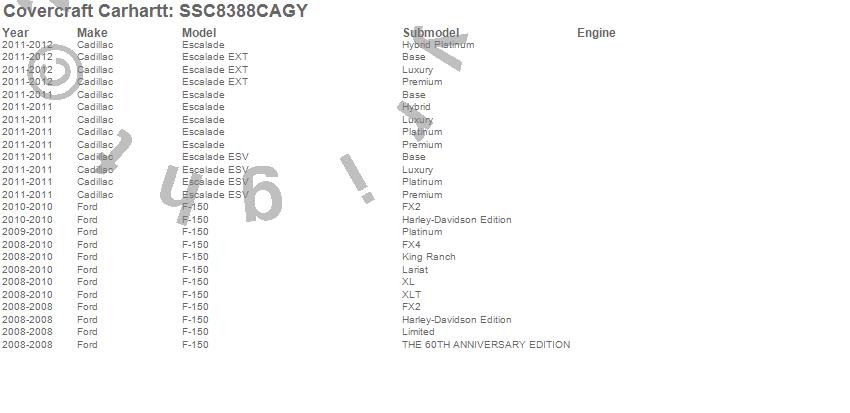 Below is an abbreviated list of applications for the Covercraft Carhartt SeatSaver.Escalade, Escalade ESV, Escalade EXT, F-150, Cadillac, Ford, 2012, 2011, 2010, 2009, 2008