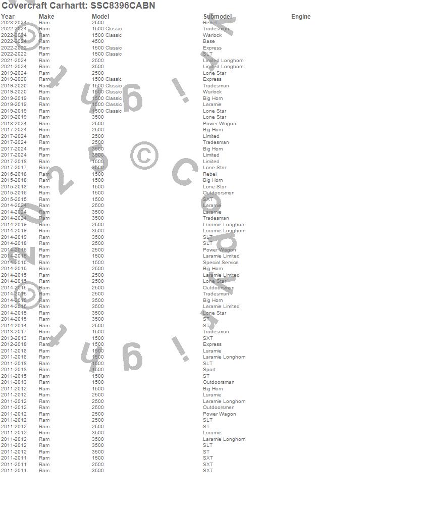 Below is an abbreviated list of applications for the Covercraft Carhartt SeatSaver.1500, 1500 Classic, 2500, 3500, 4500, Ram, 2025, 2024, 2023, 2022, 2021, 2020, 2019, 2018, 2017, 2016, 2015, 2014, 2013, 2012