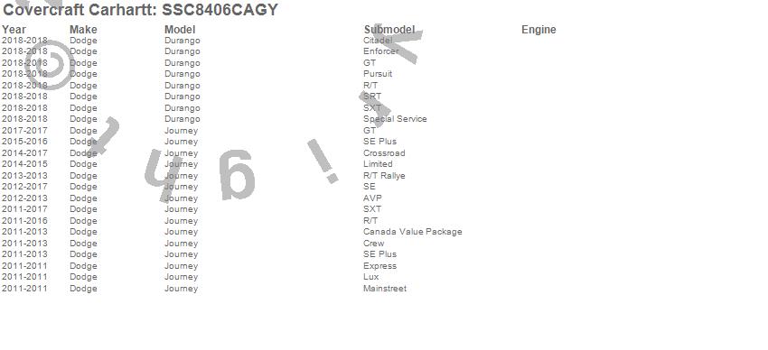 Below is an abbreviated list of applications for the Covercraft Carhartt SeatSaver.Durango, Journey, Dodge, 2020, 2019, 2018, 2017, 2016, 2015, 2014, 2013, 2012, 2011